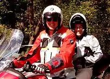 The one-piece racing leather suit, usually referred to as 'racing leathers', was first used by world champion motorcycle racer Geoff Duke in the 1950s.[1] Duke had the suit made for the purposes of streamlining, not safety, and like the majority of the leathers used at the time, was made from horsehide.
