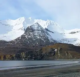 Part of the Aleutian Range, Mount Becharof is located 135 miles (217 km) west of Kodiak on the southeastern coast of the Alaska Peninsula. It is set on the west shore of Portage Bay and north shore of Kanatak Lagoon,[3] within the Becharof National Wildlife Refuge.[4] Precipitation runoff from the mountain drains into Kanatak Creek, Portage Bay, and Kanatak Lagoon. Topographic relief is significant as the summit rises over 3,000 feet (914 meters) above tidewater at Kanatak Lagoon in 1.2 miles (1.9 km). The mountain's name was published in the 1880s by the United States Coast and Geodetic Survey and the toponym has been officially adopted by the United States Board on Geographic Names.[3][5] The mountain is named in association with nearby Becharof Lake which was named in 1868 by William Healey Dall after the Russian navigator Dmitry Bocharov of the Imperial Russian Navy who explored Kodiak in 1788.[6]