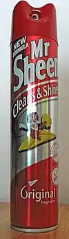 Mr Sheen is the brand name of a range of cleaning materials, mainly floor and furniture polish, created in Australia in the 1950s by Samuel Taylor Pty Ltd.[1] An aerosol, the product uses a combination of silicones, waxes and solvents and is currently manufactured by Reckitt.[1][2] Alongside Australia, Mr Sheen is also available in Jamaica, Kenya, Ireland and the United Kingdom, as well as in Zimbabwe, Zambia and South Africa where it is called Mr Min and in Argentina where it is known as Mr Frend.[1] The Mr Sheen character and branding, despite numerous revamps, has a high level of recognition amongst consumers, so much so that the company has been able to go for periods of time without even advertising the product, such as in the early 1990s.