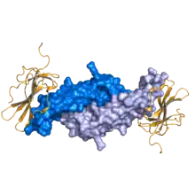 AMH is a dimeric glycoprotein with a molar mass of 140 kDa.[20] The molecule consists of two identical subunits linked by sulfide bridges, and characterized by the N-terminal dimer (pro-region) and C-terminal dimer.[5] AMH binds to its Type 2 receptor AMHR2, which phosphorylates a type I receptor under the TGF beta signaling pathway.[5]