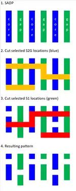 Self-aligned blocking or cutting is currently being targeted for use with SAQP for sub-30 nm pitches.[86] The lines to be cut are divided into two materials, which can be etched selectively. One cut mask only cuts every other line made of one material, while the other cut mask cuts the remaining lines made of the other material. This technique has the advantage of patterning double pitch features over lines at the minimum pitch, without edge placement errors.[37] Cut-friendly layouts are processed with the same minimum number of masks (3), regardless of using DUV or EUV wavelength.[87]