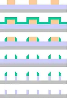 The main issues with the spacer approach are whether the spacers can stay in place after the material to which they are attached is removed, whether the spacer profile is acceptable, and whether the underlying material is attacked by the etch removing the material attached to the spacer. Pattern transfer is complicated by the situation where removal of the material adjacent to the spacers also removes a little of the underlying material. This results in higher topography on one side of the spacer than the other.[53] Any misalignment of masks or excursion in pre-patterned feature critical dimension (CD) will cause the pitch between features to alternate, a phenomenon known as pitch walking.[54]