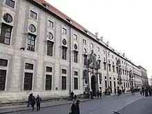 Facing the church, the Marstall, the building for the former Court Riding School (Hofreitschule) was erected under King Maximilian Joseph by Klenze between 1817 and 1822. The construction of the monumental portal arch, surmounted by busts of Castor and Pollux, is considered one of the most mature early works of Klenze. The extensive buildings for the royal stables no longer exist. From 1923 the Marstall housed the Marstallmuseum which was in 1941 moved into Nymphenburg Palace. Today the building serves as scenery house, workshop building and study stage of the Residenz Theatre.