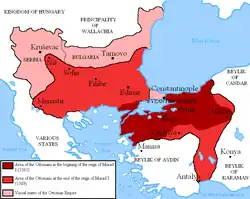 Murad I conquered Adrianople, renamed it to Edirne,[2] and in 1363 made it the new capital of the Ottoman Sultanate.[3] Then he further expanded the Ottoman realm in Southern Europe by bringing most of the Balkans under Ottoman rule, and forced the princes of Serbia and Bulgaria as well as the East Roman emperor John V Palaiologos to pay him tribute.[2] Murad I administratively divided his sultanate into the two provinces of Anatolia (Asia Minor) and Rumelia (the Balkans).
