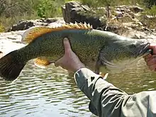 Consequently, Murray cod inhabit a remarkably wide variety of habitats, from cool, clear, fast-flowing streams with riffle-and-pool structure and rocky substrates in upland areas to large, slow flowing, meandering rivers in the extensive alluvial lowland reaches of the Murray-Darling basin.[6][8] [10][11] Murray cod have died out in many of their upland habitats, particularly in the southern Murray-Darling basin, due to a combination of overfishing, siltation, dams and weirs blocking migration, pollution from arsenic-based sheep-dips, mining, and in some cases, introduced trout stockings, which causes competition between juvenile Murray cod and introduced trout species.[11][20] [21] Murray Cod have also been introduced into other drainage basins, such as the Cooper Basin in Queensland.[22]