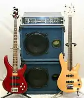 Two electric basses and a bass amplifier. This amplification setup is a bass stack approach, in which an amplifier (in this case a Hartke 5000) is plugged into separate speaker cabinets.