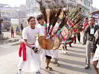 | Ghintanghisi or Ghintang ghisi | A single stick carried by dancers during festivals such as Gai Jatra. The Ghintang Ghisi dance is celebrated for almost a week, starting from the day of Gaijatra to Krishna Janmashtami. The dance is done in a long queue with two persons in a row. As dancers dance to the rhythms of drums and cymbals, they raise their ghintanghisi and tap them in the air against the instrument held by another dancer.[37][38] | Newar people | Kathmandu Valley especially Bhaktapur | ![]() Men dancing and playing ghintanghisi during Gai Jatra, in front of the Nyatapole Mandir temple in the Kathmandu Valley. | |