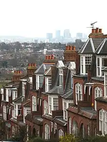 Further down the hill past the Green Man was The Elms, a squat three-storeyed house later improved by Thomas Cubitt standing in 4.5 ha (11 acres), part of the grounds of which were laid out by Joseph Paxton.[10] A short distance down the north side of Muswell Hill was The Grove, which was three storeys high and had nine bays with pedimented projections at each end.[11] It stood in 3.2 ha (7.9 acres) of grounds which contained a 184 m (201 yd) avenue of oaks. In 1774 the house was occupied by Topham Beauclerk.[12]