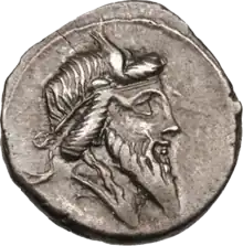 Palmer concurred with numismatists who regard a denarius minted by Quintus Titius, moneyer ca. 90–88 BC, as picturing an aged and bearded Mutunus on its obverse.[19] The winged diadem is a reference to the Priapus of Lampsacus and to the winged phallus as a common motif in Roman decorative arts, which can also serve as an apotropaic charm against the evil eye. Another issue by Titius pictures an ivy-crowned Bacchus, with both denarii having a virtually identical Pegasus on the reverse. Michael Crawford finds "no good grounds" for identifying this figure as Mutunus,[20] but Palmer points to the shared iconography of the Bacchus–Liber–Priapus figure and the associative etymology of the gens name Titius. A titus ("penis") with wings was a visual pun, since the word also referred to a type of bird.[21] Varro seems to have associated Titinus with the Titii, in an etymological collocation that included Titus Tatius, the royal Sabine contemporary of Romulus; the Curia Titia; or the tribus of the Titienses, one of the three original tribes of Rome.[22]