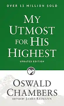 My Utmost for His Highest is a daily Christian devotional by Oswald Chambers (1874–1917) that compiles his preaching to students and soldiers. Chambers' widow self-published the book with Alden in Oxford circa 1924 (Lukabyo, "From a Ministry for Youth to a Ministry of Youth", 2020, p. 154). The book was first published in America by Dodd, Mead, & Co., in 1935. The copyright was renewed in 1963 by the Oswald Chambers Publications Association, Ltd. The "Updated Edition in Today's Language," edited by James Reimann, has appeared in a variety of formats since 1992. It relies on the New King James Version of the Bible, and has become a series of Christian devotional journals, calendars, and children's books.[2] The title is taken from one of Chambers's sermons, where he says "Shut out every consideration and keep yourself before God for this one thing only - My Utmost for His Highest".[2] The book is considered to be one of the most popular religious books ever written,[3] inspiring several people such as columnist and author Cal Thomas and President George W. Bush.[4][5]