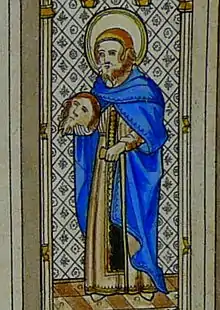 He was later re-invented as an Irish prince.[3] William Worcester names him as the son of an Irish king who became a Cornish hermit.[4] He was a contemporary of St Mannacus and St Wyllow.[5] An image of him carrying an extra head in his hands is included in a stained glass window in the church of St Neot alongside St Mabyn.[6]