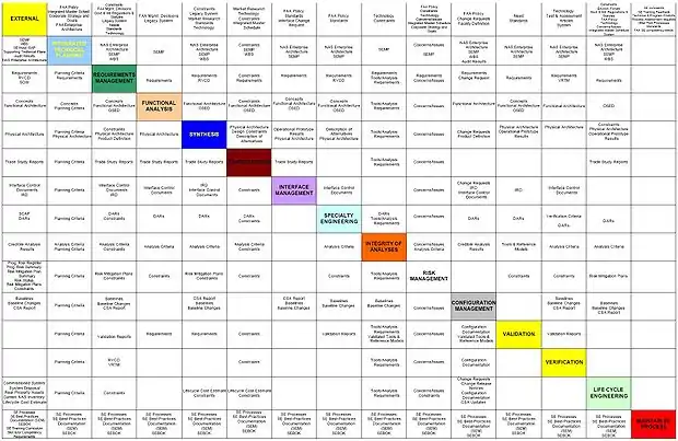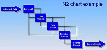 The N2 chart or N2 diagram (pronounced "en-two" or "en-squared") is a chart or diagram in the shape of a matrix, representing functional or physical interfaces between system elements. It is used to systematically identify, define, tabulate, design, and analyze functional and physical interfaces. It applies to system interfaces and hardware and/or software interfaces.[2]