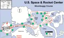 The course is designed to test rovers for stability over varying simulated lunar or extraterrestrial terrain—bumpy, sloped, and rocky—including some tight turns.[7] The first course was the actual track used by Mobility Test Articles, auditioning versions of Lunar Roving Vehicles that were used on the Moon. For the third race the course was moved a few miles, to the U.S. Space & Rocket Center. There, the track has taken varying paths through the rocket park and around the permanent lunar crater feature at the museum. Each year, the obstacles change slightly.[1]