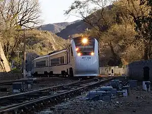 To fulfil the need for passenger transport between Beijing and Badaling during the 2008 Summer Olympics,[1] the Ministry of Railways ordered four NDJ3 DMU trains,[2] with the numbering NDJ3 0001-0004. All of them are with Beijing Bureau, Beijing sector Nanko depot, operating on Line S2 between Beijing North station and Badaling station via Yanqing station, with a later addition of another service from Beijing North to Shacheng station. These sets was the first diesel multiple units designed in China with the ability to negotiate ≥33‰ gradient and a curve of 180 m (590 ft 7 in), optimised for the steeper gradient of the S2 line, although this gearing for steeper lines also reduced the maximum speed from 180 to 160 km/h (112 to 99 mph), although they could be easily geared for higher speeds.[2]