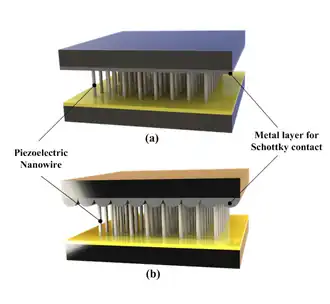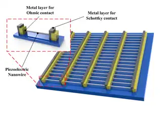 Other type. A fabric-like geometrical configuration has been suggested where a piezoelectric nanowire is grown vertically on the two microfibers in their radial direction, and they are twined to form a nanogenerator.[12] One of the microfibers is coated with the metal to form a schottky contact, serving as the counter electrode for VINGs. As the movable microfiber is stretched, the deformation of the nanostructure occurs on the stationary microfiber, resulting in voltage generation. Its working principle is identical to that of VINGs with partial mechanical contact, thus generating a DC electrical signal.