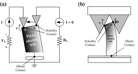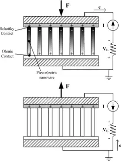 For the second case, a model with a vertically grown nanowire stacked between the ohmic contact at its bottom and the Schottky contact at its top is considered. When the force is applied toward the tip of the nanowire, the uniaxial compressive force is generated in the nanowire. Due to the piezoelectric effect, the tip of the nanowire will have a negative piezoelectric potential, increasing the Fermi level at the tip. Since the electrons will then flow from the tip to the bottom through the external circuit, positive electrical potential will be generated at the tip. The Schottky contact will stop electrons from being transported through the interface, therefore maintaining the potential at the tip. As the force is removed, the piezoelectric effect diminishes, and the electrons will be flowing back to the top in order to neutralize the positive potential at the tip. The second case will generate an alternating current output signal.[6]