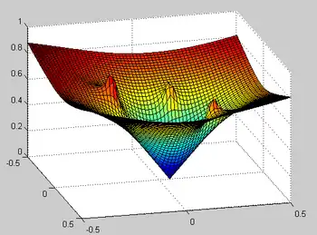A potential function. Imagine dropping a marble on the surface. It will avoid the three obstacles and eventually reach the goal position in the center.