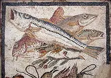 Neapolitan cooking has always used an abundance of all kinds of seafood from the Tyrrhenian Sea. Dr Johnson's friend Hester Thrale was enthusiastic for "the most excellent, the most incomparable fish I ever ate; red mullets large as our mackerel, and of singularly high flavour; beside calamaro or ink-fish, a dainty worth of imperial luxury".[4] In 1759, when Ferdinando Galiani was sent as secretary to the Neapolitan ambassador in Paris, he pined for familiar foods; he found "no fruit, no cheese, no good seafood— everything here does violence to the Neapolitan temperament".[5] Recipes use either less expensive fishes, in particular anchovies, and other fishes, like the ones used to prepare the zuppa: scorfano (Scorpaena scrofa), tracina (Trachinus draco), cuoccio (Triglia lanterna), or fishes of medium and large size, like spigola (European seabass) and orate (gilt-head bream), presently sold mainly from fish farms, or like dentice (Dentex dentex), sarago (Diplodus sargus) and pezzogna (Pagellus bogaraveo). Fishes of very small size are also used: