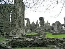 Neath Abbey was established in 1129 AD when Richard I de Grenville (d.post 1142), one of the Twelve Knights of Glamorgan, gave 8,000 acres (3,200 ha) of his estate in Glamorgan, Wales, to Savigniac monks from western Normandy.[1] The first monks arrived in 1130. Following the merging of the Savigniac order into the Cistercian order in 1147, Neath Abbey also became a Cistercian house. The abbey was ravaged by the Welsh uprisings of the 13th century.[2] During the Dissolution of the Monasteries by King Henry VIII of England the last abbot, Lleision ap Thomas, managed to buy time through payment of a large fine in 1536, but the abbey was dissolved in 1539.[3]