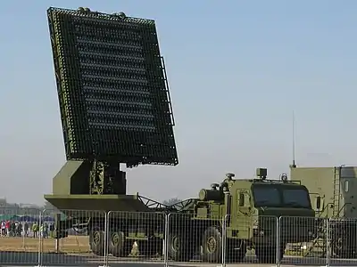 The Nebo-M[1] or Nebo-ME (in Cyrillic: 55Ж6МЕ «Небо-МЕ», Nebo means "sky") also known as RLM-ME or 55Zh6ME (export version)[2] is an integrated multi-functional radar system that features a multiple programmable multi-band design radars and a central data fusion. The radar began to be investigated in 1984. The radar complex is made up of a command post module and one to three different radars which are deployed on separate 8x8 24-ton trucks. The manufacturer claims this radar system can detect 5th generation aircraft like the F-22 and F-35[3] and detect long-range ballistic missile launches. Nebo-ME is an export version with some downgraded characteristics.