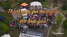 Three edits of the finale episodes were created for different broadcast territories. In Ireland, all three episodes were broadcast separately on consecutive nights.[60] For the British broadcast, episodes 8902 and 8903 were edited together, creating a "specially-created hour" format with a "bespoke" teaser voiced by Stefan Dennis.[61] Commercial tracks were also added to the UK broadcast, more extensively than in any previous episodes. Barnett claimed that that the episode features "a mix of contemporary and classic" songs each chosen to suit the scene and "enhance the viewer experience".[61] Production added songs from Harry Styles and George Ezra, but these were not featured in the Australian edition.[62] The original Neighbours theme song, performed by Barry Crocker was used at the end of the episode.[8] The end credits feature a montage of photographs from former and present characters before a message appeared on the screen stating: "Thank you for loving us, we love you."[63]