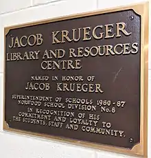 The school's library and resources centre, located on the main floor of the school, also stands in dedication of a former superintendent of schools of Norwood School Division No.8: Jacob Krueger.
