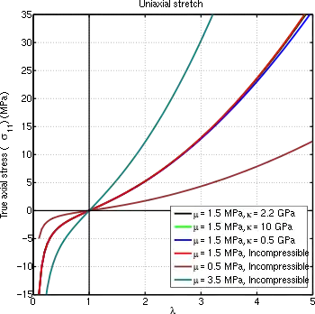 ![]() The true stress as a function of equi-triaxial stretch predicted by a compressible neo-Hookean material for various values of . The material properties are representative of natural rubber. |