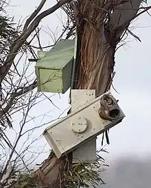 Nesting boxes intended for use by orange-bellied parrots in Melaleuca, South West Tasmania
