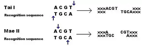 For example:Prototype MaeII A^CGT produces DNA fragments with a 2-base 5' extension Neoschizomer TaiI ACGT^ produces DNA fragments with a 4-base 3' extension