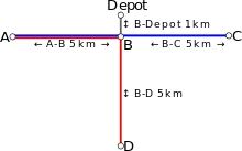 • Both lines begin at point A, and run on a common route 5 km (3.1 mi) long to point B.
