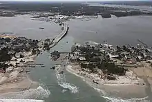 On February 1, 2013, Route 35 through Mantoloking was fully reopened after being closed since October 29, 2012 after Hurricane Sandy hit the area. The night of the storm at the intersection where the Mantoloking Bridge and Route 35 meet, a new inlet was formed by the raging storm waters. This effectively cut off the island from the mainland.[27]
