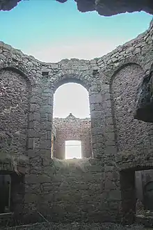 The defensive works of the castle include the use of the North Sea cliffs; an abyss to the west that functions as a deep impassable moat; and a ruined rampart that would have been the main entrance on the south.[18] The ruins include reasonably well-preserved elements of three- and four-storey structural elements and a basement course over some of the range, especially at the eastern side. There are well-preserved basement kitchen works with numerous fire pits and masonry indented storage spaces. The internal doorways are primarily of well-preserved wooden lintel construction, with numerous examples of mortared sandstone and medieval brickwork archways. The interior of the ground level is a maze of passageways and smaller rooms, reflecting a high state of occupancy in 17th-century times.