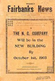 In May 1904, Hill sold the Weekly Fairbanks News to R. J. McChesney, who invested in a Linotype machine and a larger press. These improvements and the growing population of Fairbanks — by 1905, it had 2,500 residents — allowed the Weekly Fairbanks News to expand to semi-weekly, then daily publication, in the process becoming the Fairbanks Daily News on July 1, 1905.[13]: 9 On September 3, the News had its first competition when the Fairbanks Sunday Times began publishing on the sole day that the News did not. Other papers soon arrived in the area. In 1906, the Valdez News reported, "With the newspaper plans already in Fairbanks and with those which are being shipped there this year, the Tanana metropolis will be well supplied. There are no less than five of them all told ..."[14] In May 1906, McChesney sold the Daily News to Fairbanks' founder, Ebenezer Barnette. Later that month, an enormous fire destroyed the Daily News press and much of Fairbanks.[13]: 10