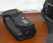 The MB-D10 allows the D300 to be powered by an additional EN-EL3e battery or AA batteries. An optional carrier is available which allows for an EN-EL4 or EN-EL4a battery to be installed instead. The camera can be configured to assign priority to either the internal EN-EL3e battery or the MB-D10 grip such that the other battery is used only when the primary battery is dead.