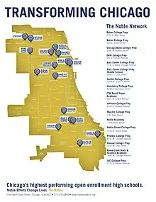 Noble Schools (formerly known as the Noble Network of Charter Schools and as Noble Street Charter School) is an open enrollment, public charter network of high schools and middle schools serving students throughout Chicago. Noble was co-founded in 1999[2] by Michael Milkie and Tonya Hernandez through a partnership between Ron Manderschied, President of Northwestern University Settlement House.[3][4] Noble's first expansions, Rauner College Prep and Pritzker College Prep, opened in 2006. There are currently 18 schools in the charter school network: 1 middle school and 17 high schools.[5] Noble schools are public and open to all students in Chicago and there is no testing required for admission.[6]