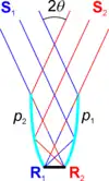 When seen from the CPC, the incoming radiation (emitted from the infinite source at an infinite distance) subtends an angle ±θ (total angle 2θ). This is called the acceptance angle of the CPC. The reason for this name can be appreciated in the figure "rays showing the acceptance angle" on the right. An incoming ray r1 at an angle θ to the vertical (coming from the edge of the infinite source) is redirected by the CPC towards the edge R1 of the receiver.