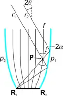 The light crossing this point is confined to a cone of angular aperture 2α. A line f is also shown whose tangent at point P bisects this cone of light and, therefore, points in the direction of the "light flow" at P. Several other such lines are also shown in the figure. They all bisect the edge rays at each point inside the CPC and, for that reason, their tangent at each point points in the direction of the flow of light. These are called flow-lines and the CPC itself is just a combination of flow line p1 starting at R2 and p2 starting at R1.