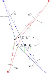 The rays emitted from edge S1 of the source are focused onto edge R1 of the receiver and those emitted from edge S2 of the source are focused onto edge R2 of the receiver. We first choose a point T0 and its normal on the top surface of the lens. We can now take a ray r1 coming from S2 and refract it at T0. Choosing now the optical path length S22 between S2 and R2 we have one condition that allows us to calculate point B1 on the bottom surface of the lens. The normal at B1 can also be calculated from the directions of the incoming and outgoing rays at this point and the refractive index of the lens. Now we can repeat the process taking a ray r2 coming from R1 and refracting it at B1. Choosing now the optical path length S11 between R1 and S1 we have one condition that allows us to calculate point T1 on the top surface of the lens. The normal at T1 can also be calculated from the directions of the incoming and outgoing rays at this point and the refractive index of the lens. Now, refracting at T1 a ray r3 coming from S2 we can calculate a new point B3 and corresponding normal on the bottom surface using the same optical path length S22 between S2 and R2. Refracting at B3 a ray r4 coming from R1 we can calculate a new point T3 and corresponding normal on the top surface using the same optical path length S11 between R1 and S1. The process continues by calculating another point B5 on the bottom surface using another edge ray r5, and so on. The sequence of points T0 B1 T1 B3 T3 B5 is called an SMS chain.