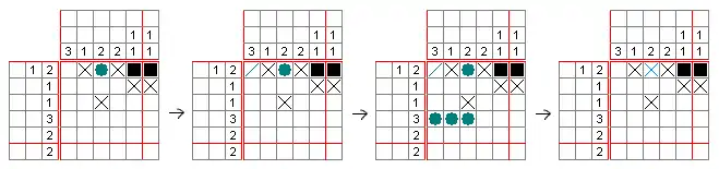 In this example a box is tried in the first row, which leads to a space at the beginning of that row. The space then forces a box in the first column, which glues to a block of three boxes in the fourth row. However, that is wrong because the third column does not allow any boxes there, which leads to a conclusion that the tried cell must not be a box, so it must be a space.