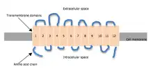 2) group and carboxyl (-COOH) group. In addition, there is a large extracellular loop located between TMD 3 and 4.[14][6][15] The protein is composed of 617 amino acids.[14]