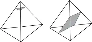 A normal surface intersects a tetrahedron in (possibly many) triangles (see above left) and quads (see above right)