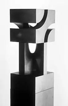 Carlberg's sculptures often consist of repetitions of such a unit, a basic shape capable of combining with other such elements in various ways—somewhat in the way a composer such as Bach or Webern might compose a piece of music by exploring the combinatorial possibilities of a single motivic cell, working within implicit constraints. At Yale, Erwin Hauer was an important influence who prodded Carlberg in this stylistic direction. While both men often employed curvilinear forms as modules, Carlberg more often used relatively geometric, hard-edged design units, often combining curves with straight edges (or flat planes) in the same module. His prints, mostly dating after 1970, show a similar preoccupation with precision, simplicity, and modularity. Some are actually groups of prints, placed contiguously together on a wall, with each print conceived as a module.[10]