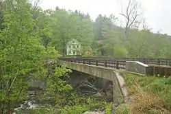 Most of the properties in the district are strung in a widely spaced rural manner along East River Road, extending from a home and former factory site in the north to a village core with church and cemetery in the south. A few unbuilt parcels of land on Smith and North Chester Roads also contribute to the district, as did the Howe truss iron bridge that carries Smith Road across the middle branch of the Westfield River until its replacement in 2009. In addition to a variety of primarily 19th century residential and agricultural buildings, the district also includes a number of industrial archeological sites, based on the area's history of water-powered mill development.[2]