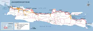 The North Coast Road (Indonesian: Jalur Pantai Utara (Jalur Pantura)) is a road 1,430 km in length,[1] that connects Cilegon and Banyuwangi along the northern coast of Java, particularly between Jakarta and Surabaya.