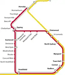- All stations from Epping to Strathfield, then Redfern, Central, and all stations to Gordon, then all stations to Hornsby.