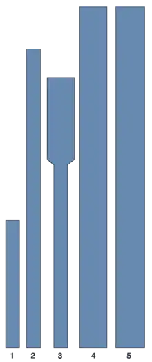 • Nagoya obi (名古屋帯) – also called kyūsun nagoya obi (九寸名古屋帯, "nine-inch nagoya obi")[17] – is the most-used obi type today. A nagoya obi is distinguished by its structure: one end is folded and sewn in half, the other end is of full width.[16] This is to make putting the obi on easier. A nagoya obi can be partly- or fully-patterned. It is normally worn only in the taiko musubi style, and many nagoya obi are designed so that they have patterns only in the part that will be most prominent in the knot. Nagoya obi are shorter than other obi types, about 315 centimetres (10.33 ft) to 345 centimetres (11.32 ft) long, but of the same width, about 30 centimetres (12 in).[19]