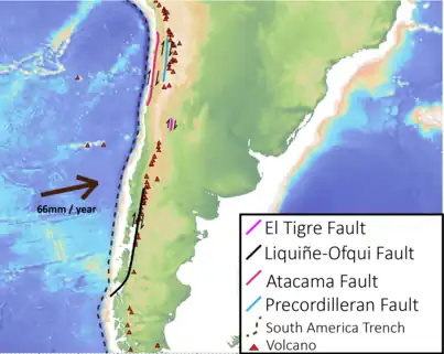 Four major trench parallel strike slip faults are identified in the oblique subduction zone.[27] Liquiñe-Ofqui Fault is a 1,200 km long fault that located in the southern Andes.[45] Left lateral strike slip motion was active during Mesozoic period.[46] In Pliocene period, strike slip motion of the fault system changed to right lateral motion to accommodate the trench parallel slip component from oblique subduction.[47][48]