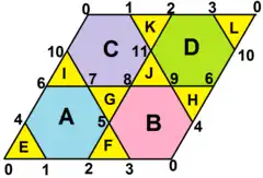 The topological net of faces can be arranged as a rhombus divided into 8 triangles and 4 hexagons. All vertex angle defects are zero.