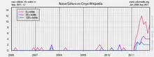 Started in June 2002, it reached one thousand articles in May 2011.[4][8][9] As of 1 January 2024, it has 17,533 articles, the 133rd on the list of Wikipedias according to article count.[10] Odia Wikipedians have organized meetups and workshops in seven different cities like Bhubaneswar, Cuttack, Anugul, Balasore, Bangalore and New Delhi[11] across India.[12] The readership has increased over 300% in the last six months. The page views per month is at 4.38 million. This Wikipedia ranks 134 among the 289 world language Wikipedias, as of 23 August 2015.[13][14]