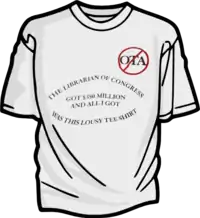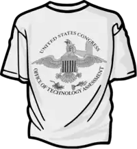 The front and back of a tee shirt created and worn by some staff of the OTA to express their sentiments about the intent of the 104th Congress to terminate their service while simultaneously increasing the Library of Congress' budget by an amount equal to nearly twice that of OTA's. Compare to the official seal above, and note the arm of Congress strangling the symbolic U.S.A. in the satirical version.